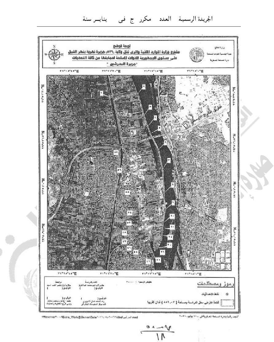 كما استند القرار إلى قرار رئيس مجلس الوزراء رقم 1383 لسنة 2005 بشأن حماية نهر النيل وشواطئه، وصدر استنادا إلى موافقة مجلس الوزراء، وبناء على ما عرضه المركز الوطنى لتخطيط استخدامات أراضى الدولة.